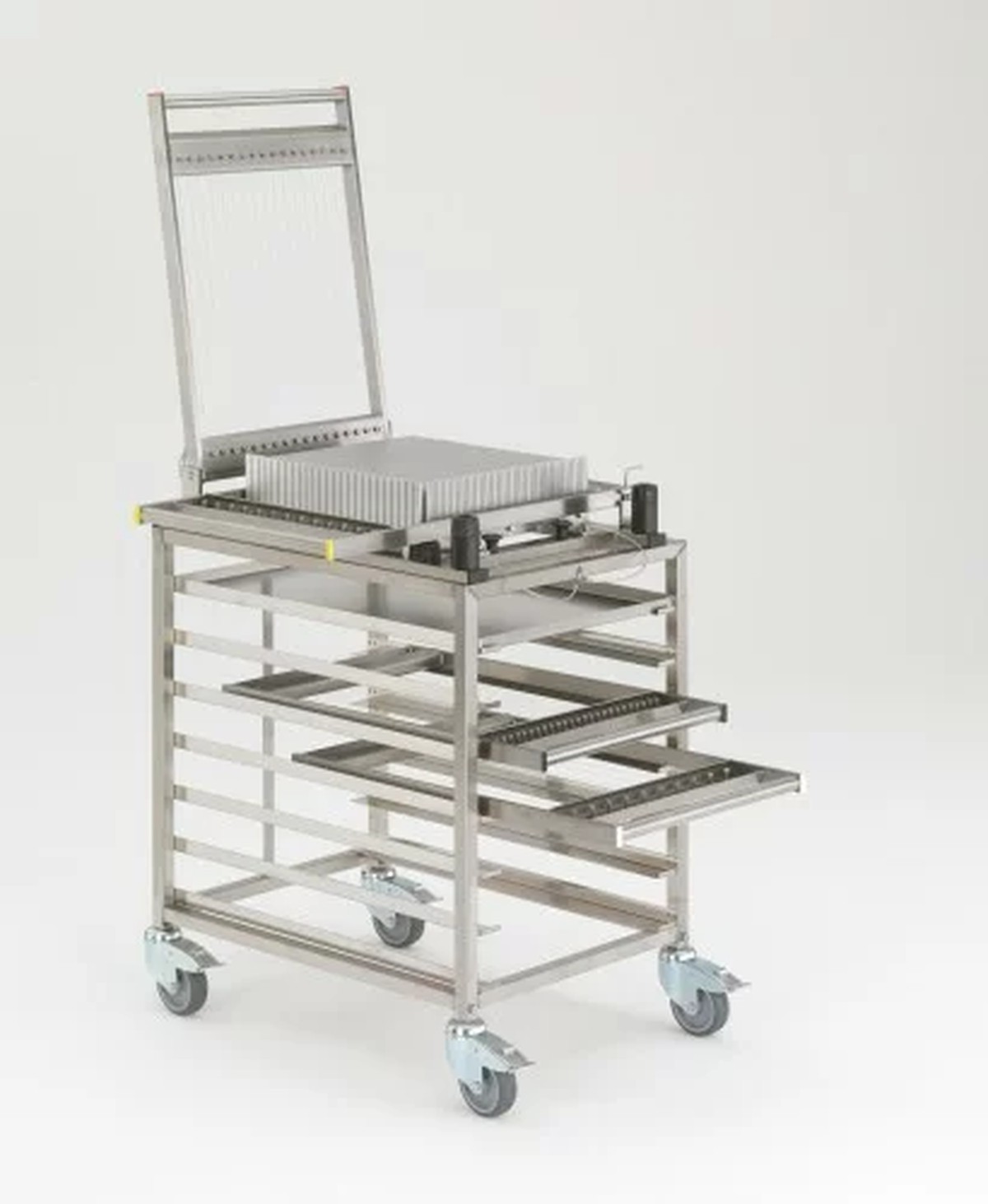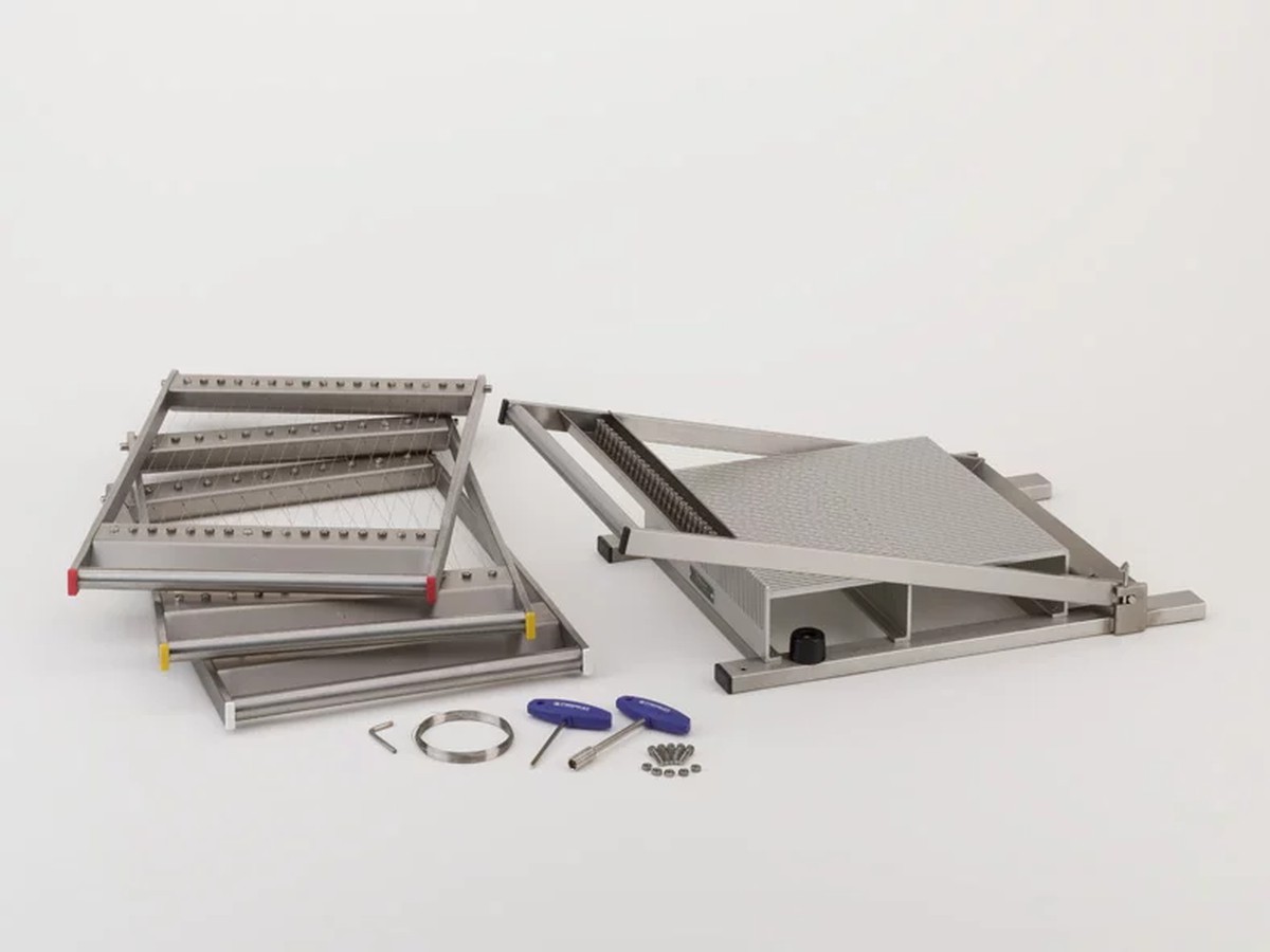 The first cut is made by using the corresponding frame cutter. A thin sheet of stainless steel which is part of the set is pushed under the cut substance from behind and the strips are lifted off. The frame cutter is opened, and the strips are turned 90° before being cut a second time – the result is a square shape. To get a rhombi-like shape, the strips are placed transversely. If the goal is a rectangle, different frame cutters are used for the second cut. The base is made out of anodized aluminium; all other parts are made of stainless steel.